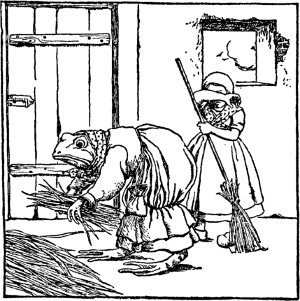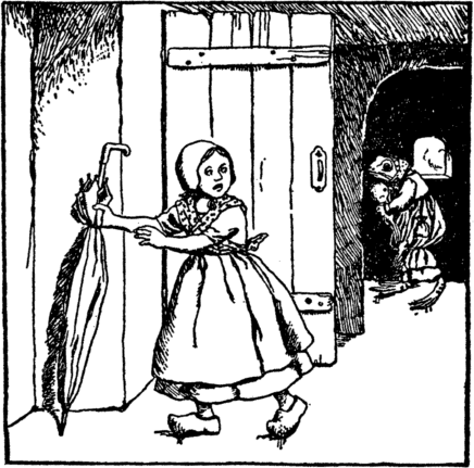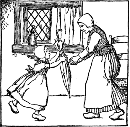 And Jane's big green umbrella Old Webtoes hides away; She makes her sweep, she makes her scrub; Jane has no time to play. She spreads a bed of rushes, Where Jane may sleep at night, And wakes her in the morning As soon as it is light. |