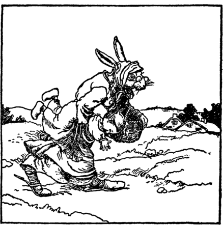 But yet Eliza did not heed; She was a naughty girl indeed. So now the rabbit witch has come, And carries her away from home. |