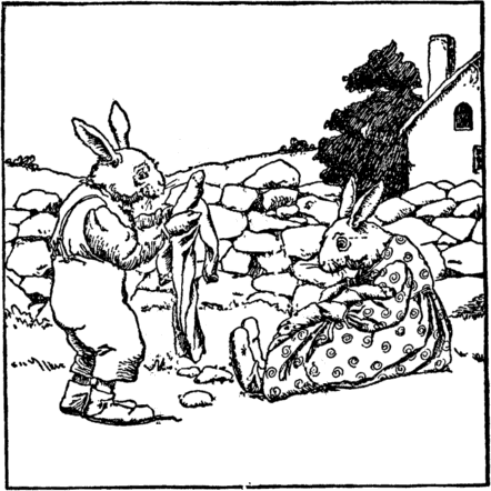 Down in the marshes far away The rabbit's children squeak and play; They tease Eliza till she cries, And with her apron hides her eyes. |