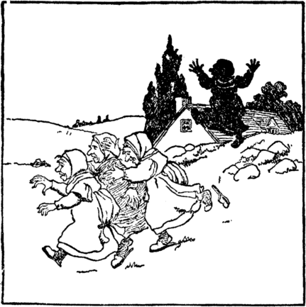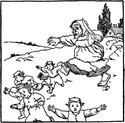 Now see her coming down the hill! Now see the children run! Her arms are long, her hands are strong, She catches every one. In vain the children kick and scream, The ogress takes them home And locks the door; then off she goes To bid the neighbors come. |
