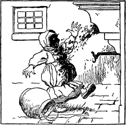 Then from the chimney Peter bawls, "We're hiding, stupid face!" "Oh, oh!" the ogress says, "I know; You're up the chimney place." So up the chimney now she looks; "I'll fetch you out," she cries; But puff! the clever Peter blows The soot down in her eyes. |