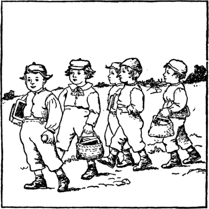These small boys started off for school But loitered by the way, Until at last 'twas quite too late To go to school that day. Ah naughty, naughty, truant boys! But listen what befell! Close by a wicked ogress lived, Down in a lonesome dell. |