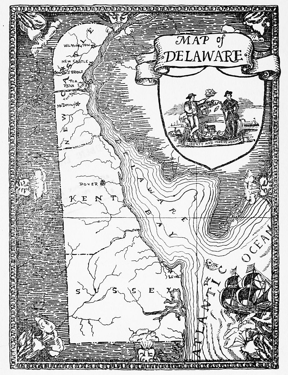 These true stories are written just for you. They tell how once upon a time brave men and women came across the ocean and landed here in the wilderness, among the Indian tribes; how they made farms and towns and cities and formed a state; and how they fought for the freedom and the peace that Delaware now enjoys. Only thirteen out of the forty-eight states of our Union are original colonies, and Delaware is one of these famous thirteen. You are the young citizens, therefore, of an historic state. To you it will fall, some day, to uphold the honor of Delaware. May you be as patriotic and as brave as the Delaware settlers who conquered the wilderness and the Delaware soldiers who laid down their lives for liberty and right.
