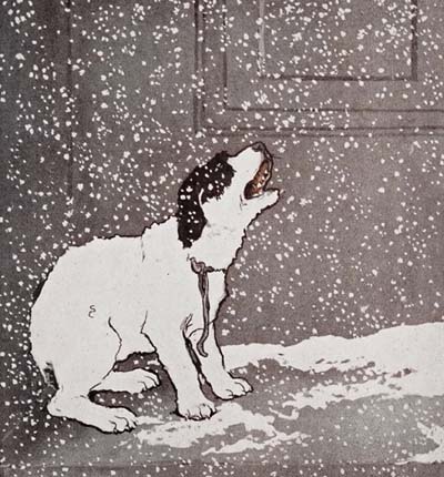 I stood there shivering for a while, and then I went up the brown stone steps and got in a corner of the doorway there. The wind was so cold and[9] I was so lonesome and miserable that I began to howl. I howled and howled, and the snow blew against me, and all up and down the street there didn’t seem to be anything alive but me.