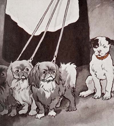 The names of the three dogs were Prince Coco and Bijou and Fifine. Prince Coco was rather old and fat. Fifine was a snappish little dog. I liked Bijou best, but they were all very proud and haughty with me. They were the kind of[15] dogs that are called Pekinese. They said that was the finest kind of dog that any dog could be, and Prince Coco told me he and the others were very handsome and worth a great deal of money. (Money is what you give to people when you want to get something from them.)