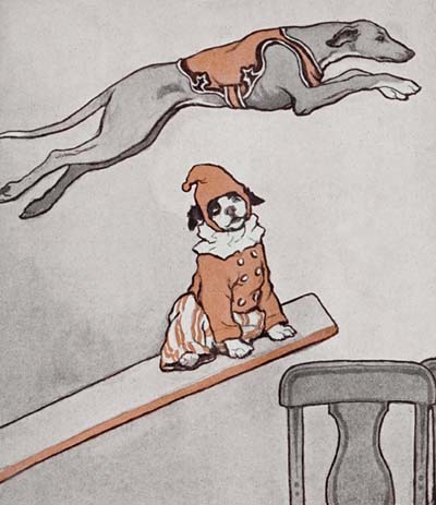 There were big boards standing in the hall of[77] the theatre, with pictures on them,—and one was a picture of me! Me, in my clown clothes up on a high stool and grinning. The other dogs were sniffing about and didn’t see it, and I wouldn’t have seen it only Mr. Bonelli stooped and picked me up in his arms. “Now look! Look at yourself, my little clown dog,” said he. “Is it not a good likeness?” And he took hold of my head and turned it toward the picture.