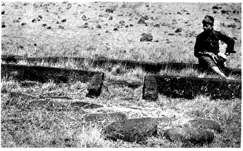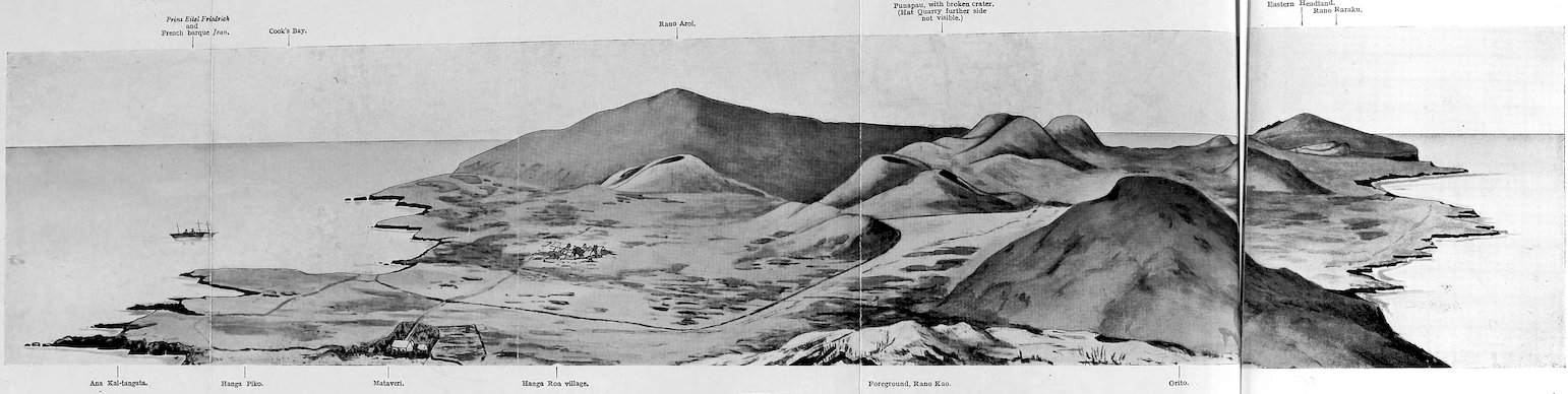44. Of these clan names, “Raa” means the sun and “Marama” the light. The signification of the others is not equally clear, and the natives could give no assistance; but Mr. Ray gives the following interesting information from other Polynesian sources. “Haumoana” means the sea-breeze; “Hitiuira” is probably “hiti-ra” or sunrise; and “Ureohei” another version of “ura-o-hehe,” or red of sundown. “Koro-orongo” is doubtless from “Koro-o-Rongo,” or the ring of Rongo (a well-known Polynesian deity), that is the rainbow. “Kotuu” appears to be a contraction of “Ko Otuu,” meaning “The Hill”; the name “Otuu” is used alternatively for the same district. “Hotu” is another form of the word for hill and “Iti” signifies small, it presumably refers to Rano Raraku.