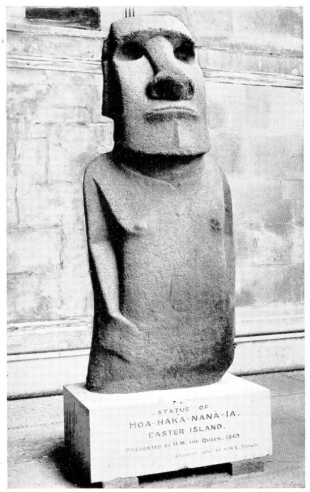 With regard to our journeyings and labours in the field, we are under great obligation to Mr. Edwards, the Chilean Minister in London, through whose representations his Government were good enough to grant us special facilities in their ports. The Expedition owes much to Messrs. Balfour & Williamson of London, and the firms connected with them in Chile, California, and New York; most especially to Messrs. Williamson & Balfour of Valparaiso for their permission to visit Easter Island and help throughout. We are also very grateful to the manager of the ranch, Mr. Percy Edmunds, for his practical aid on the island; since we left he has obtained for us a skin of the sacred bird which we had been unable to procure, and forwarded with it the negative of fig. 65, taken at our request.