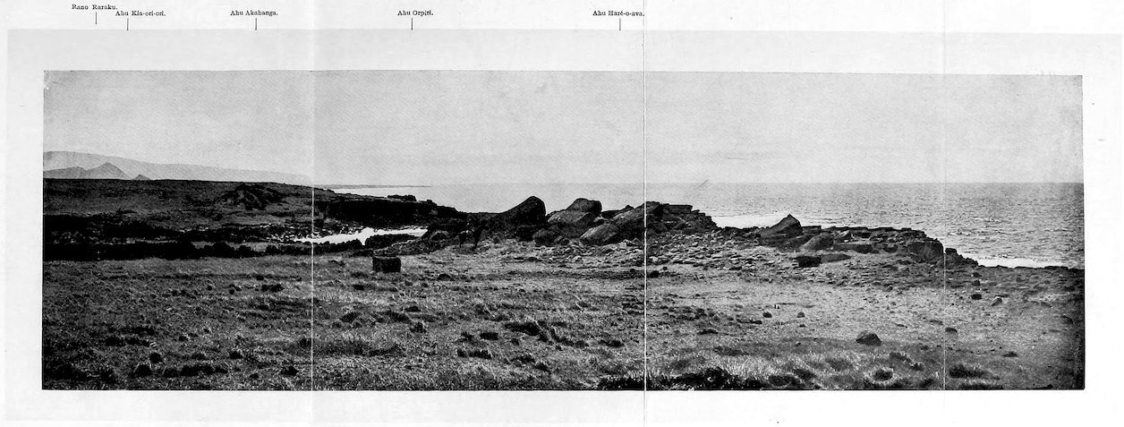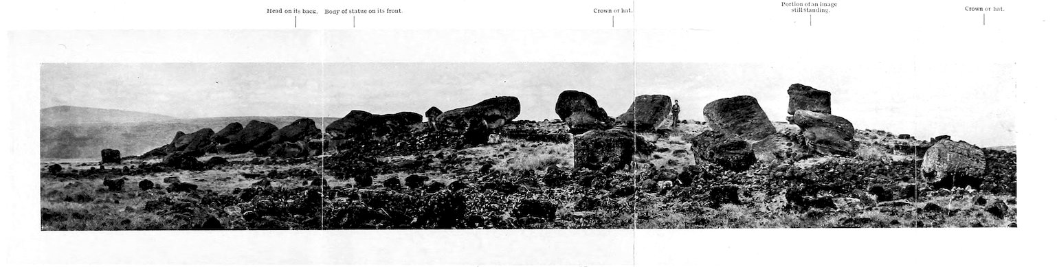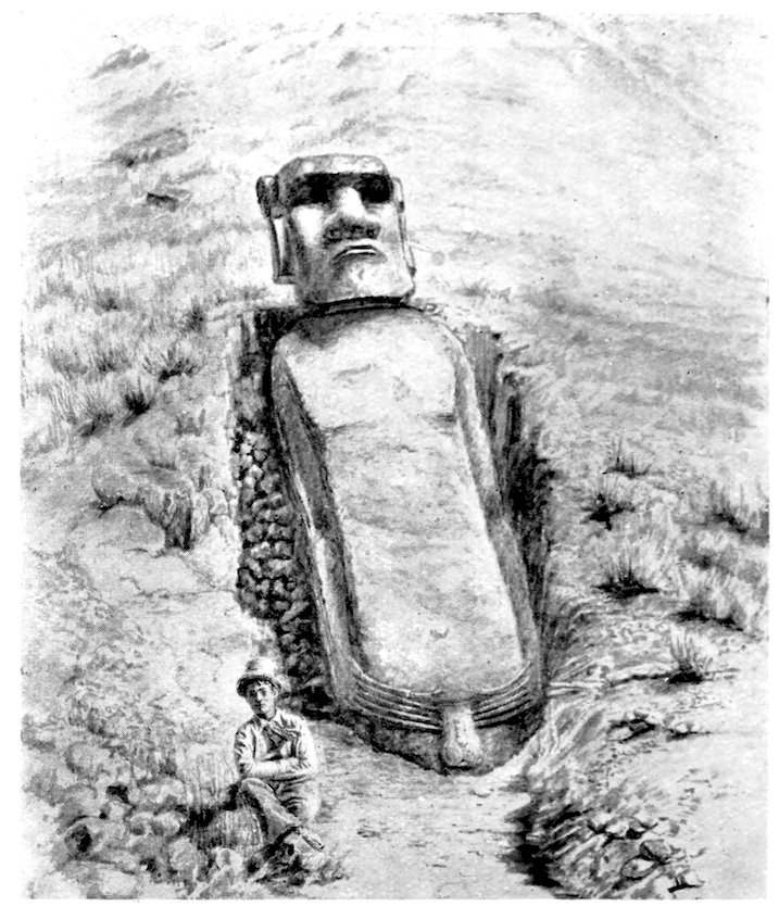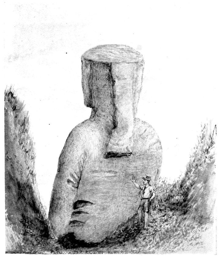 59. Recollection is naturally clearer of the removal of the statue now at Washington, and particularly of the excellent food given to the natives who assisted. The figure is reported to have been taken from Ahu Apépé, an inland terrace not far from Rano Raraku, and been dragged down to the ship as she lay in La Pérouse Bay.