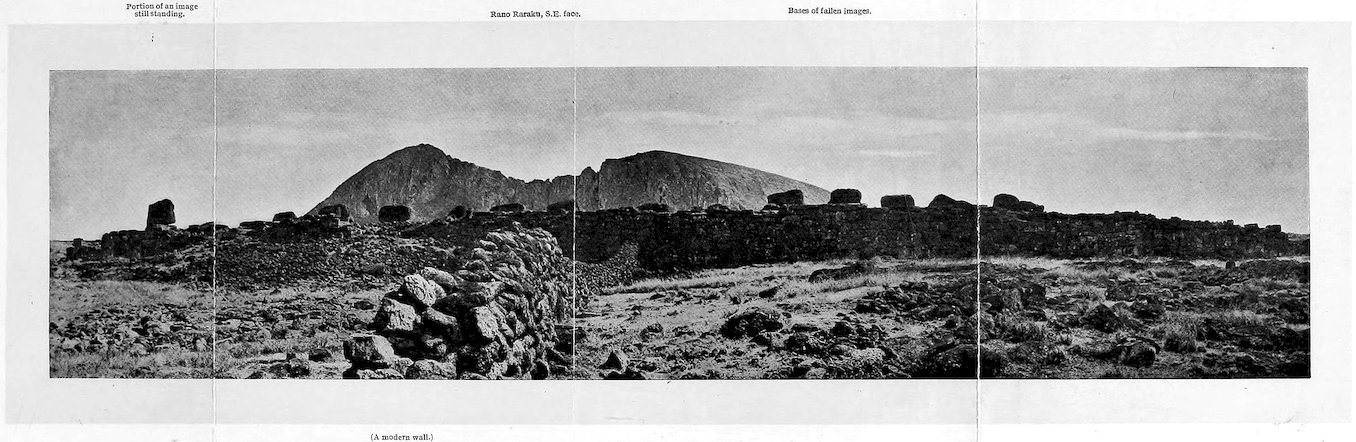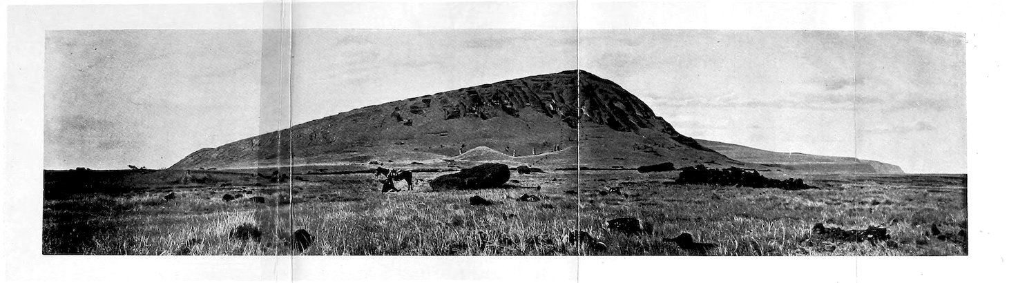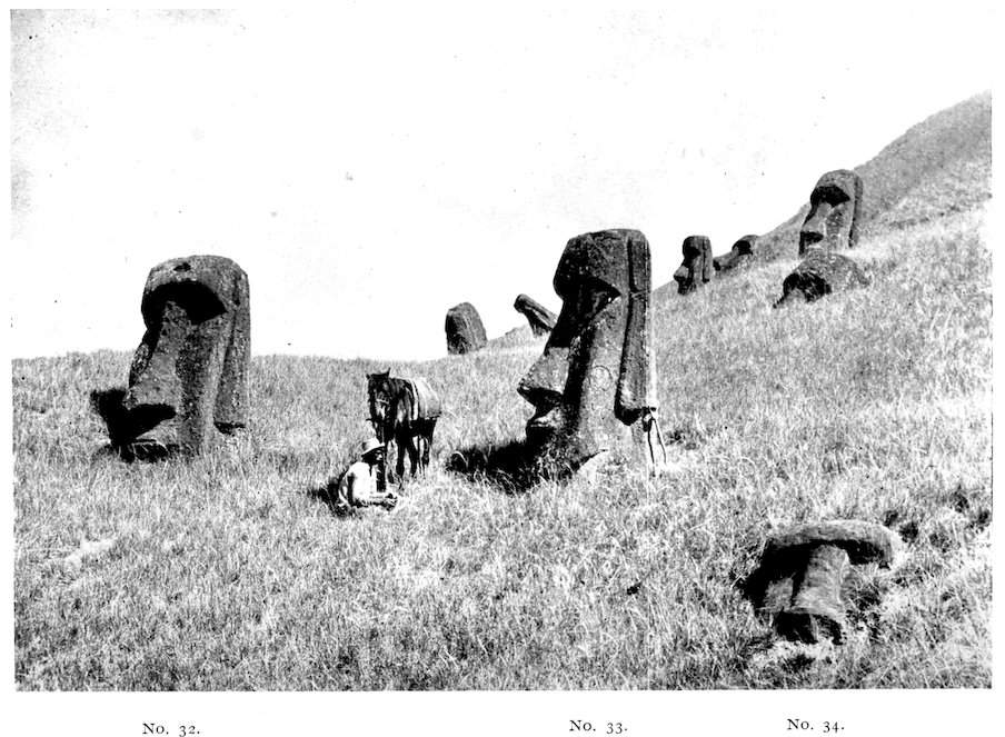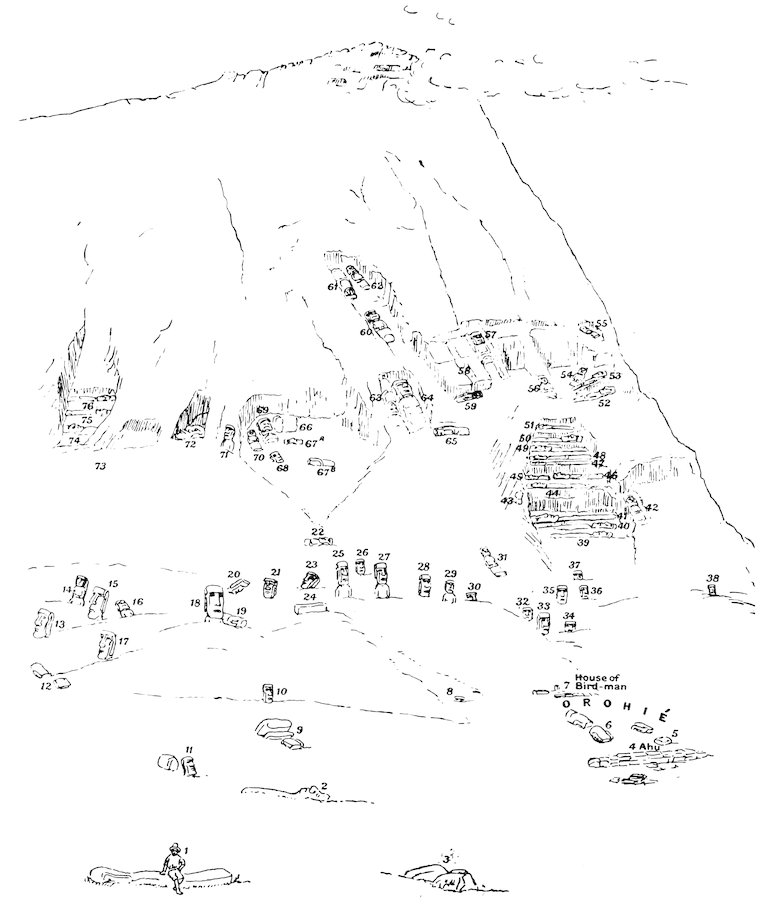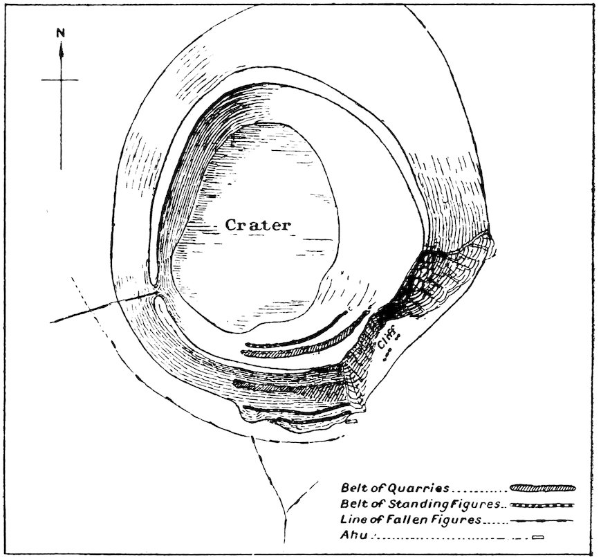 | Rano Raraku, its Quarries and Standing Statues—The South-east Face of the Mountain—Isolated Statues—Roads—Stone Crowns of the Images. | ||