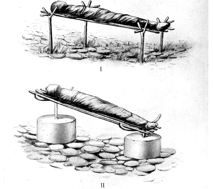 47. “These bodies, enveloped in mats, are placed on a heap of stones or on a kind of wooden structure, the head being turned towards the sea. Now, as all the population live round the island, dried skeletons are to be met all along this coast, and no one seems to take any notice of them.”—Letter from Brother Eyraud—Annals of the Propagation of the Faith, Jan. 1866.