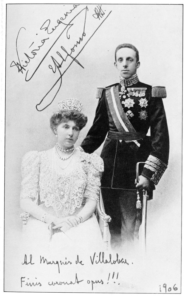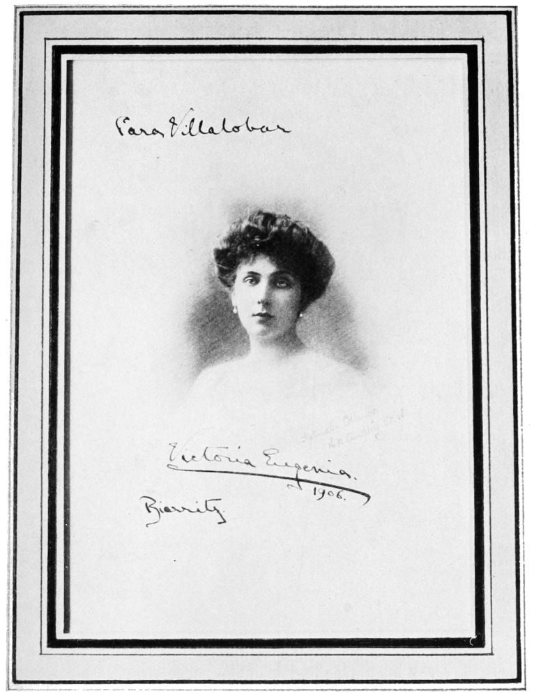 Does this read like a pretty fairy tale, written for children? Possibly. But it isn’t; at least, if it is a story and pretty, it is every word true, for “the Jubilee Baby” was Queen Victoria’s thirty-second grandchild, the daughter of Princess Beatrice and Prince Henry of Battenberg. The Isle of Wight of Southern England was the home of the Battenbergs and Princess Victoria Eugenie Julia Ena—or Princess Ena, as she was generally called—was Queen Victoria’s favourite grandchild. When Princess Ena was eight years old, her father, Prince Henry, went off to the Ashanti campaign in Africa and when his ship was detained a few days at Gibraltar, he ran up to Seville, from where he wrote the letter—the only letter he ever wrote to his little daughter—telling her that one day she would come to Spain and be happy. This letter was written in November and in December, Prince Henry died of a fever contracted in the deadly climate of that part of the African coast. Ten years later, King Alfonso XIII went to England, met Princess Ena and within the twelve month, they were married and now she is Queen Eugenie of Spain!{7}
