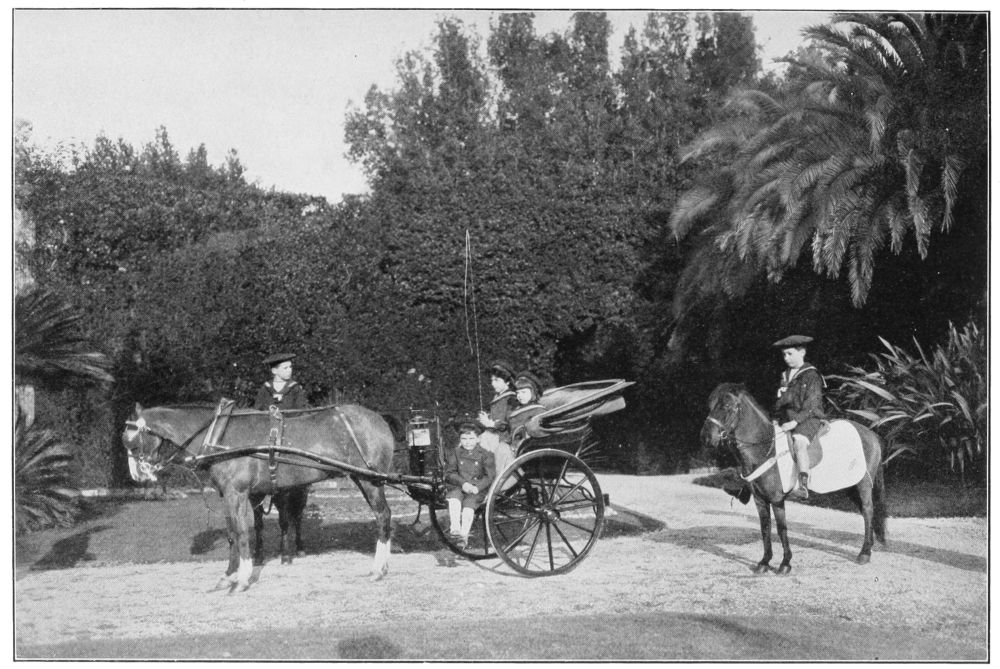 The prettiest sight I know in Rome is when the Royal Princesses and the little Crown Prince, Humbert, go driving. I lived for a winter in an apartment adjoining the Quirinal Palace, so that it frequently fell to me to catch glimpses of the Royal Family going or coming. Like the King and Queen, they drive out almost daily during the months the Royal Family spend in the capital, but it was the little ones who always caught my eye and made me turn to watch so long as they were in view. Usually there are the three girls, and a nursemaid holding the Prince on her knees. Their carriage is an ordinary two-horsed, double-seated coach. Immediately behind the carriage always ride two guards, on bicycles, men in plain, dark-blue clothes with knee breeches. A stranger in the city would not even notice them, although if one were observant he might observe many of the passers-by lifting their hats and turning to watch. Almost every pleasant afternoon, when the King is in residence in Rome, immediately after lunch, or on a Saturday forenoon, the children are driven just outside the walls of Rome to Villa Savoy, a playhouse which is all their own. During that portion of{250} the year spent in Rome this is practically the only change they have from the Palace nursery and the Quirinal gardens—the latter by no means a cramped play-ground. When the Duke of Ascoli, Gentleman-in-Waiting to Queen Elena, first showed me these grounds I was quite astounded by their extent and their unique beauty. There are long avenues of boxwood hedges, groves of dark firs and picturesque parasol pines, fields of untended grass and acres of carefully nurtured flowers. And all this behind the dull yellow Quirinal walls, fairly in the centre of the city. But any growing kiddies long for more than the yard of a city home, though that yard attain the proportions of a park, and the home be a Palace. Villa Savoy supplies the want, and here the children have their ponies and their pet donkey. Here Queen Elena, too, finds relief and refreshment, for the quiet of the children’s playhouse is never intruded upon by the court or visitors who are not intimates of the Royal Family.