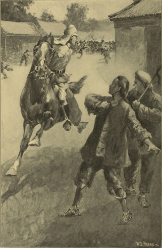 Fumbling in the darkness of this almost-forgotten water-gate, the beggar found a bar so rusted and worn by age that he could force a way through. When he emerged on the other side of the wall he was covered with black, vile-smelling mud. It rendered him so disgusting an object that even a Chinese could not tolerate his presence, and, whenever he approached one with a whining plea for alms, he was driven away with blows and curses. Thus he wandered on from group to group, through many streets, until he came to a gate in the eastern wall of the southern city that was guarded by a troop of Chinese cavalry. These amused themselves by teasing him, until, at length, one of them, tired of the sport, said: