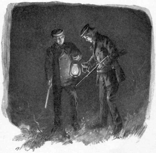 They willingly agreed to do this, and on that very night, while they were patrolling opposite sides of the camp, Serge sprang upon a skulking figure who, by a violent effort, wrenched himself free and escaped, leaving only a broken watch-chain in the lad’s hand. To his unbounded amazement, when he and Phil examined this trophy by lantern-light, he found attached to it, as a charm, the identical bit of carved ivory that he had given to his comrade in New London, and which the latter had lost so long ago.