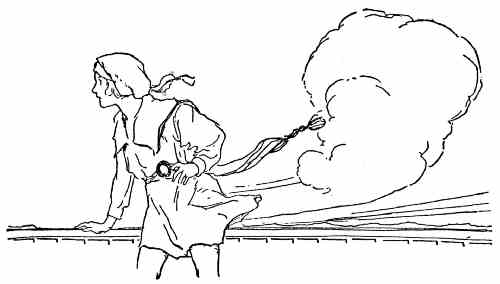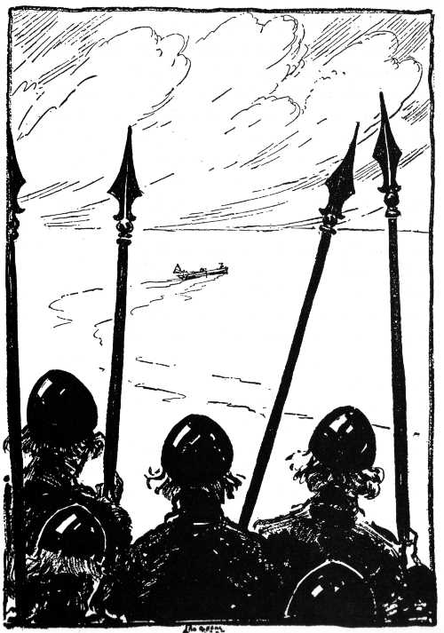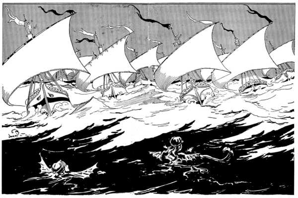 One morning, just as the royal party was finishing breakfast, a servant came running to say that a great fleet of boats was approaching the island from the south. King Kitticut sprang up at once, in great alarm, for he had much cause to fear strange boats. The others quickly followed him to the shore to see what invasion might be coming upon them.