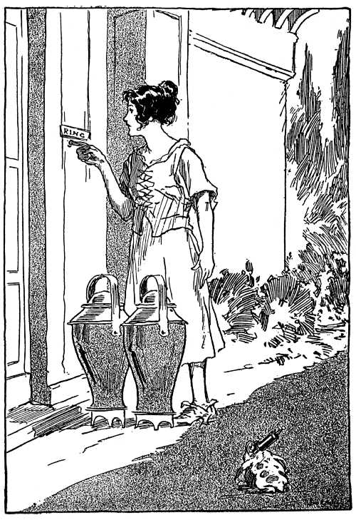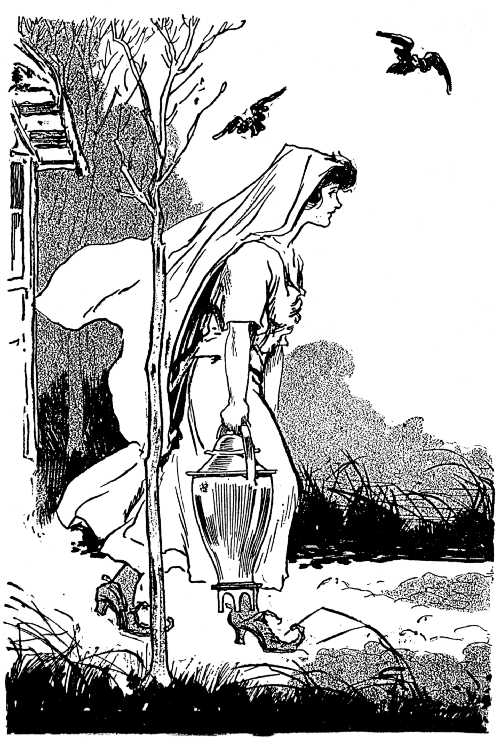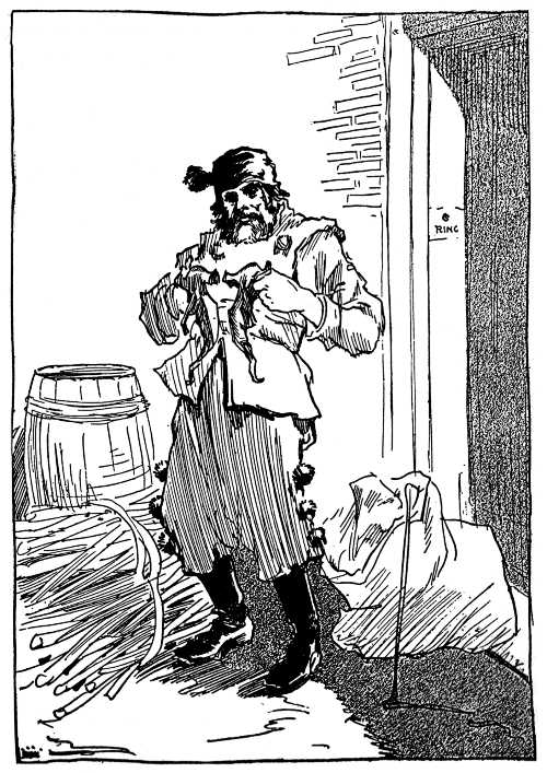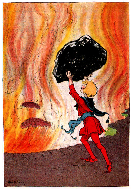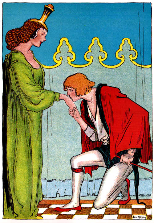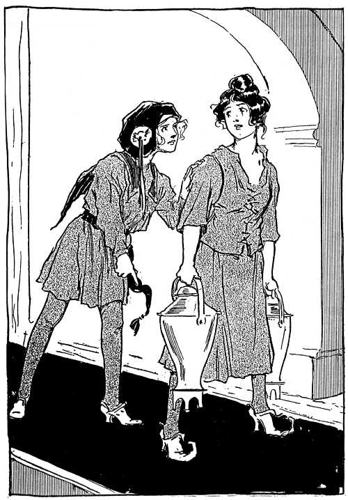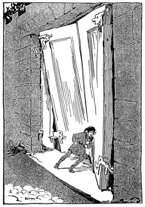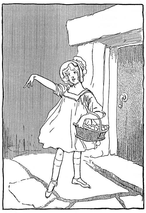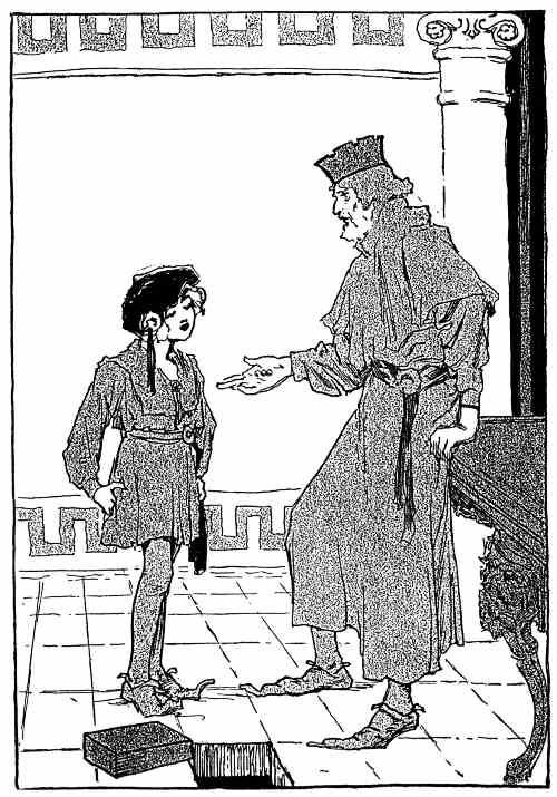 He led the way through the rooms of the palace until they came to the great banquet hall. There, stopping in the center of the room, he stooped down and touched a hidden spring in the tiled floor. At once one of the tiles sank downward and the King reached within the cavity and drew out a silken bag.