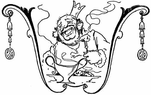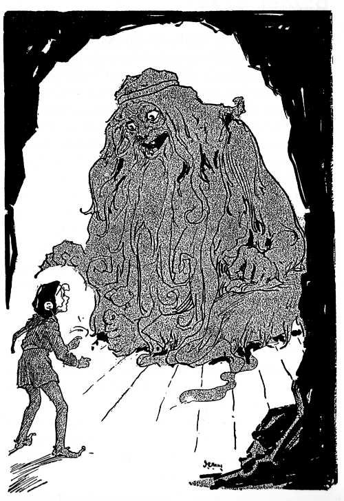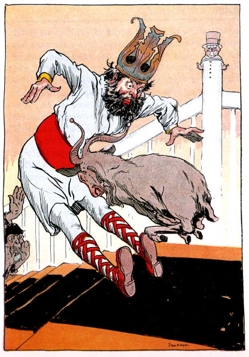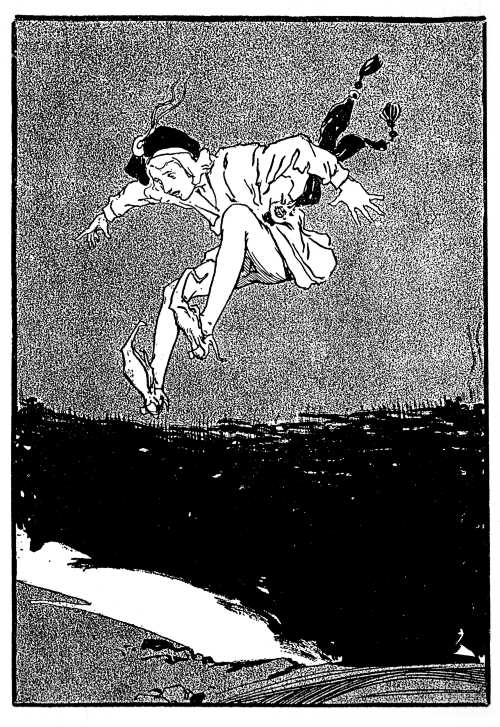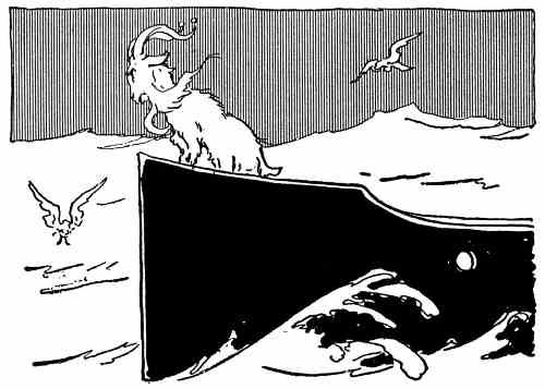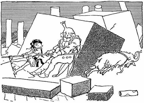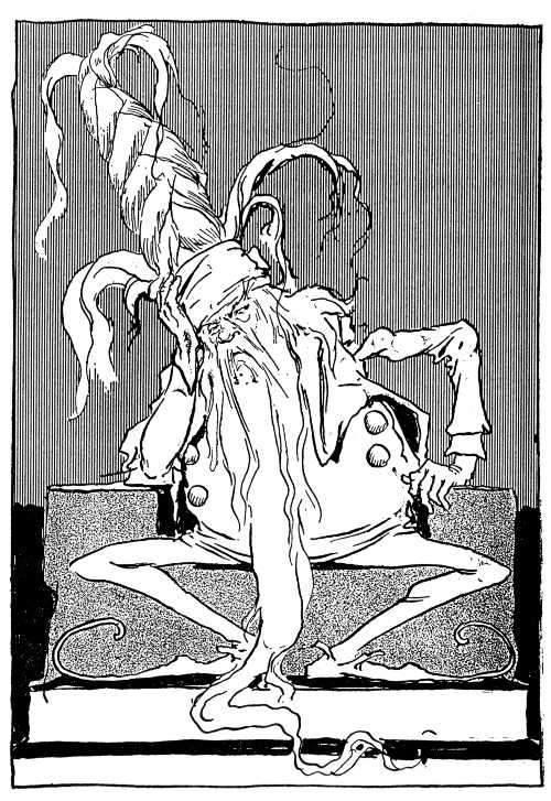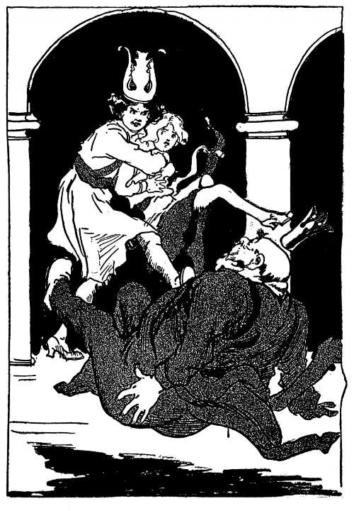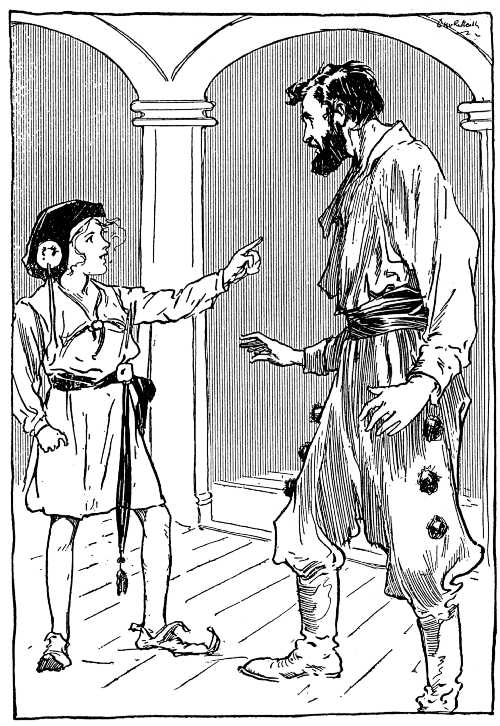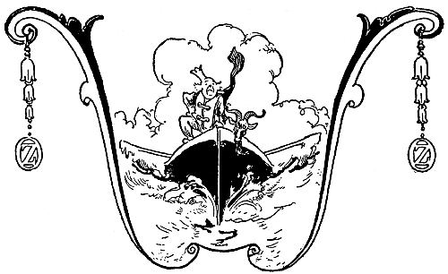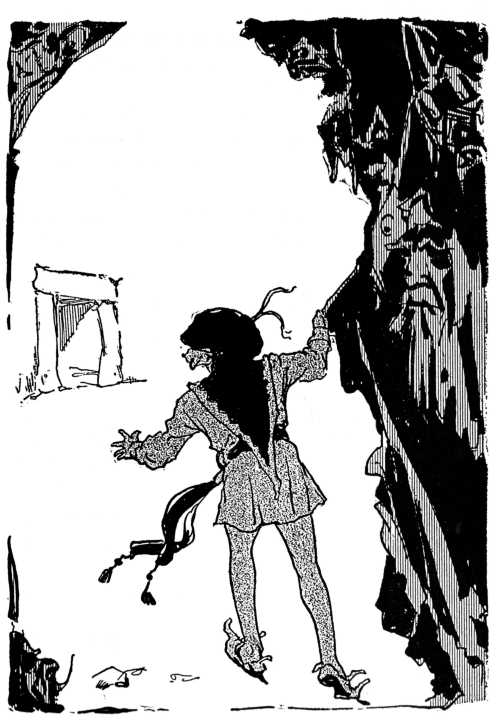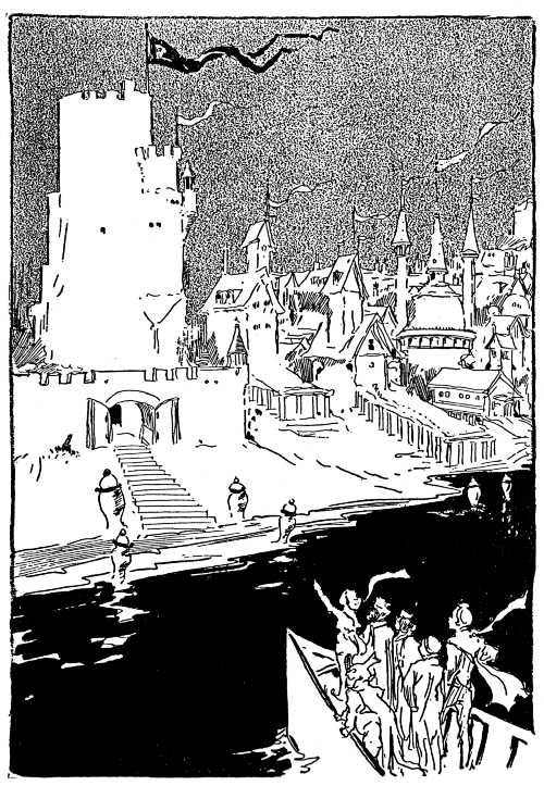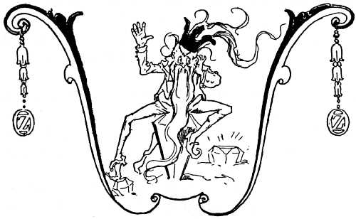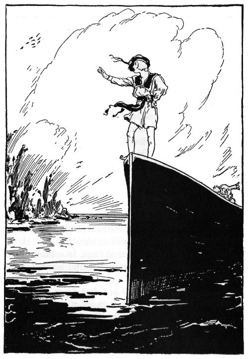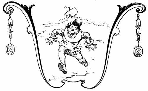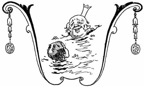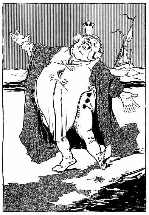 The prow of the boat grounded on the beach, stopping its speed so suddenly that the little man was caught unawares and nearly toppled headlong into the sea. But he managed to catch hold of the chair with one hand and the hair of one of his rowers with the other, and so steadied himself. Then, again waving his jeweled cap around his head, he cried in a merry voice: