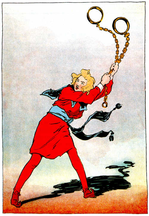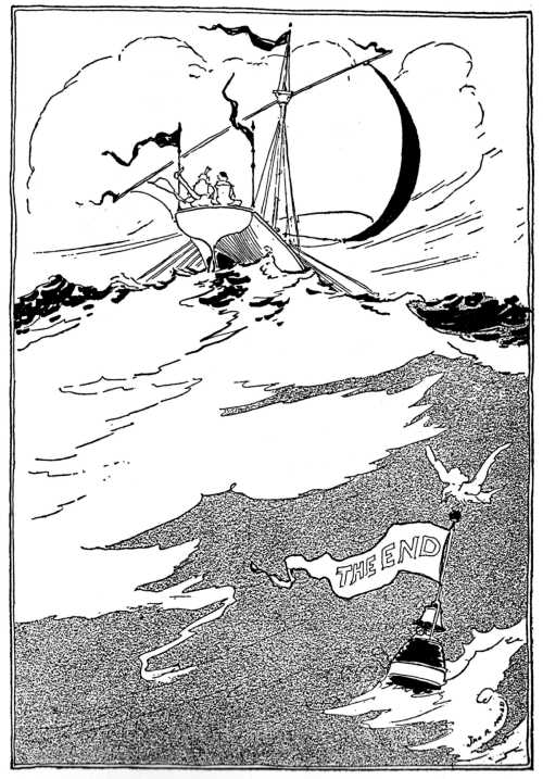 Then, at last, the hour of parting arrived and the King of Gilgad and Ruler of the Dominion of Rinkitink was escorted by a grand procession to his boat and seated upon his golden throne. The rowers of the fifty boats paused, with their glittering oars pointed into the air like gigantic uplifted sabres, while the people of Pingaree—men, women and children—stood upon the shore shouting a royal farewell to the jolly King.