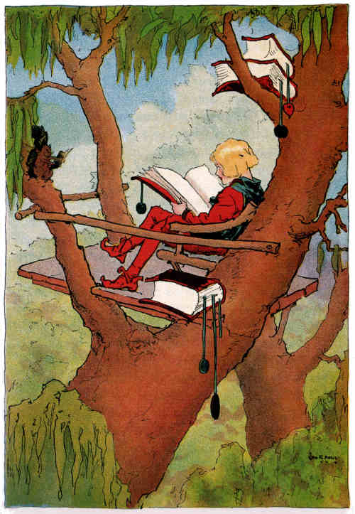 When studying his lessons Prince Inga used to go into the grove near his father's palace and climb into the branches of a tall tree, where he had built a platform with a comfortable seat to rest upon, all hidden by the canopy of leaves. There, with no one to disturb him, he would pore over the sheepskin on which were written the queer characters of the Pingarese language.