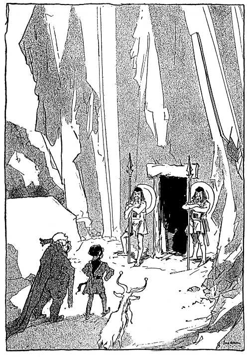 It was quite a big boat, they observed, and covered with a canopy of purple silk, embroidered with gold. It was rowed by twenty men, ten on each side. As it came nearer, Inga could see that in the stern, seated upon a high, cushioned chair of state, was a little man who was so very fat that he was nearly as broad as he was high. This man was dressed in a loose silken robe of purple that fell in folds to his feet, while upon his head was a cap of white velvet curiously worked with golden threads and having a circle of diamonds sewn around the band. At the opposite end of the boat stood an oddly shaped cage, and several large boxes of sandalwood were piled near the center of the craft.