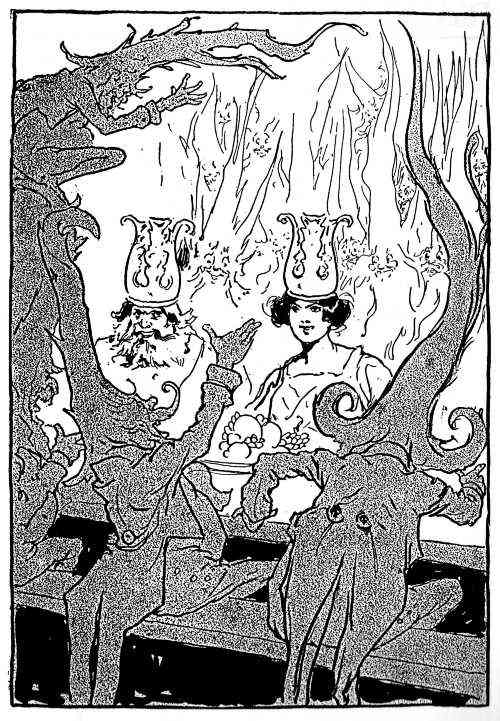 It was unfortunate that the famous Scarecrow—the most popular person in all Oz, next to Ozma—was absent at the time of the banquet, for he happened just then to be making one of his trips through the country; but the Scarecrow had a chance later to meet Rinkitink and Inga and the King and Queen of Pingaree and Prince Bobo, for the party remained several weeks at the Emerald City, where they were royally entertained, and where both the gentle Queen Garee and the noble King Kitticut recovered much of their good spirits and composure and tried to forget their dreadful experiences.