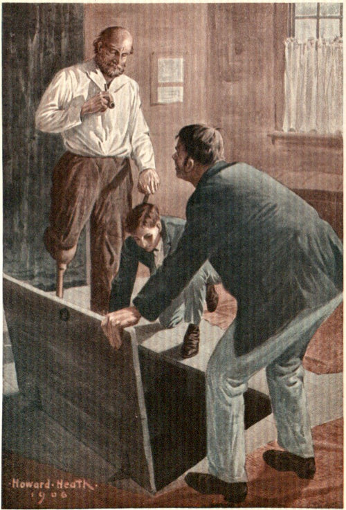 Uncle Naboth was already making a careful inspection of the old rag carpet that covered the floor. In one corner the tacks seemed far apart and scanty. He seized the carpet and jerked it away from the fastenings, disclosing a small square trap with an iron ring in the center.