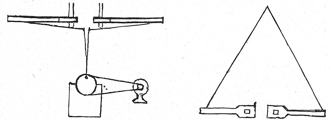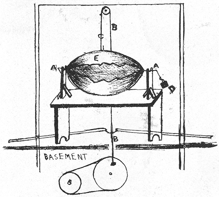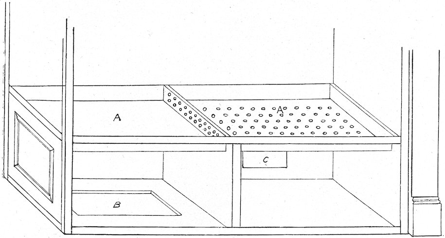 B, opening for lighting and ventilating the cellar. A trap door may be arranged to fit over the opening B, but a better arrangement is to have two sashes of glass to fit the front of the openings immediately back of the wire screens shown in Fig. 2. If hinged at the top, they can be opened by pulling back with a cord or chain from the inside of the room.
