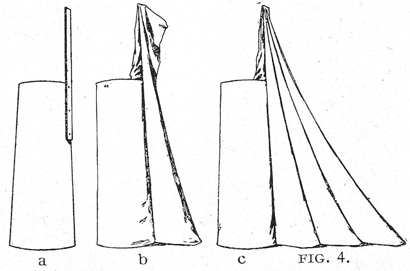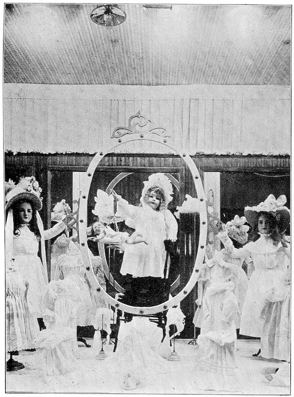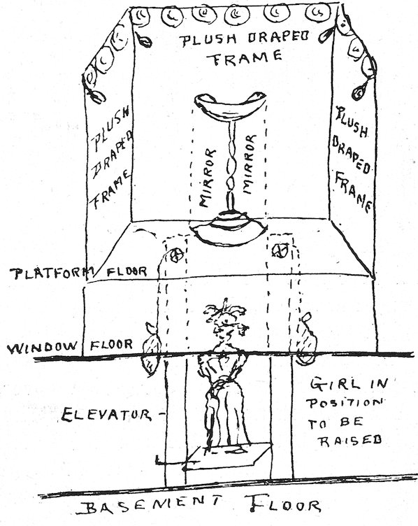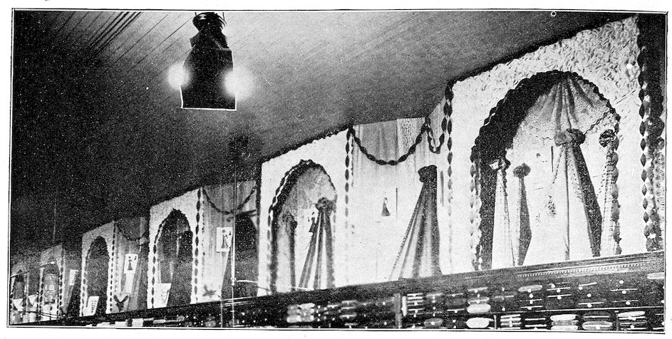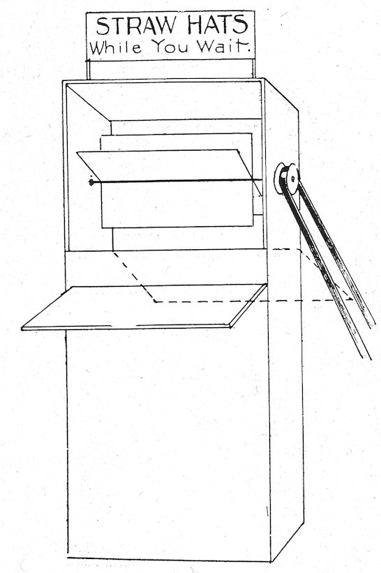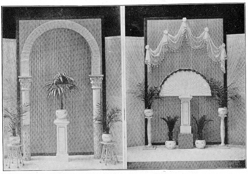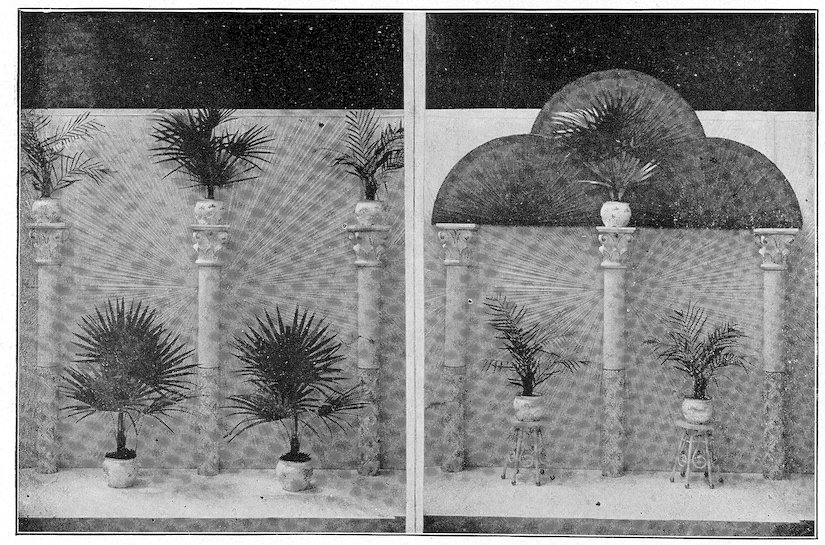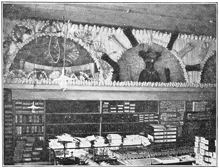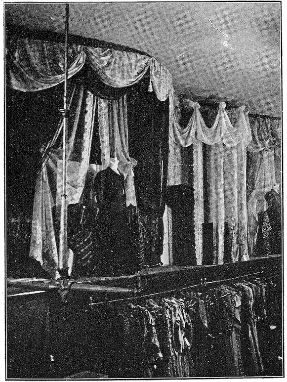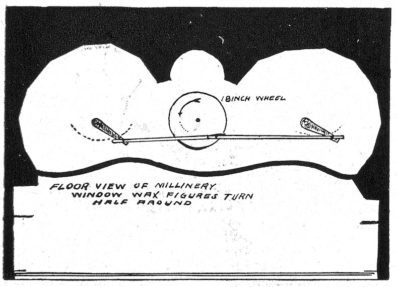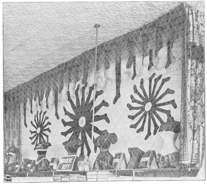 11All windows should have a substantial board backing and sides extending about one-half the height of the window itself. A door should be made in this at one side, to permit the trimmer easy entrance and enable you to reach any goods you may wish to withdraw from the window. Above this backing it is desirable to have a sash reaching to the ceiling, which will serve to admit light and prevent dust reaching the trim.