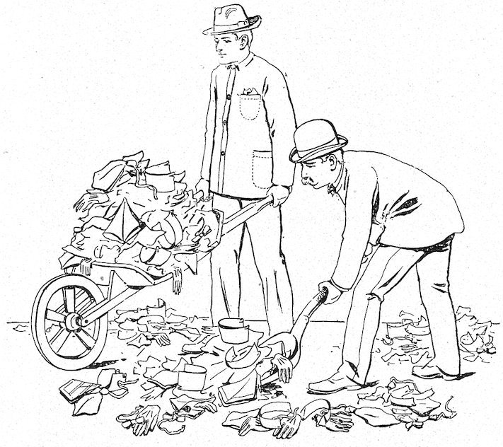 Many merchants dread window washing day. It shouldn’t be a bugbear when a simple method like the following is understood. Wait until the sun is off the window, for if the sun is shining on the glass it will look streaked after drying, irrespective of the amount of muscle expended in the rubbing. Dust the window thoroughly, inside and out, and don’t touch the glass until after the inside woodwork has been cleansed. Use nothing but warm water, mixed with sufficient ammonia in washing the glass. Steer clear of soap. Dry the windows with the rubber cleaner or soft cotton cloth. Linen leaves lint on the glass. Polish with paper; that’s all that’s necessary.