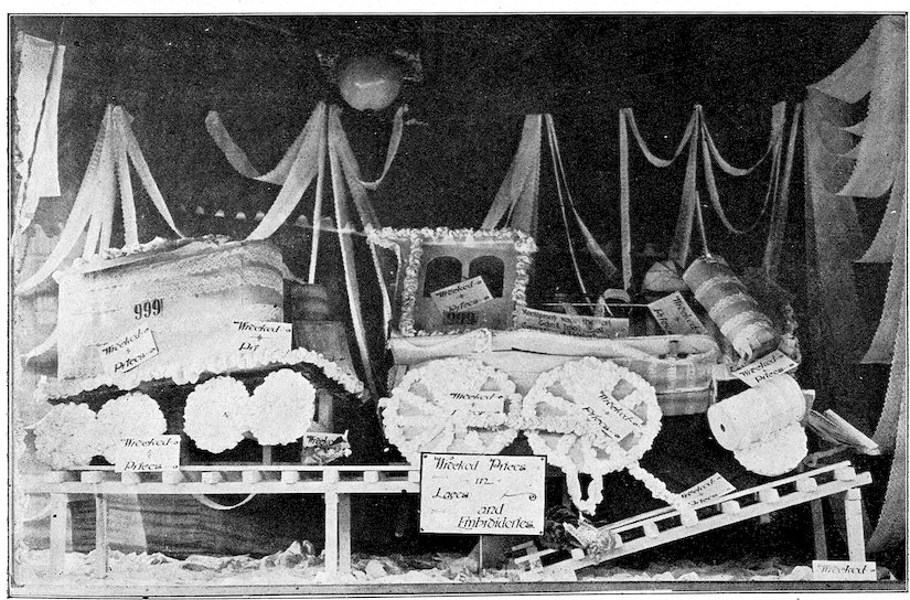 In the selection of goods for your window two classes are best. First, new goods, of which there is ample stock; for, being new and seasonable, they are in demand and can be sold with profit and the money reinvested. Second, old goods which must be disposed of, probably at a sacrifice, in order that the money tied up in them may be used to better advantage. These last are “bargain” windows and each article must bear its price ticket. Cut the price sufficiently to interest people. Bear in mind that these goods might lie on your shelves years without moving if there was no show window to dispose of them. Properly displayed and properly priced, the show window will sell them like hot cakes, even though they are old enough to have gray whiskers. People dearly love bargains.
