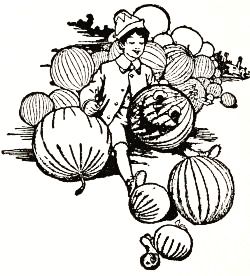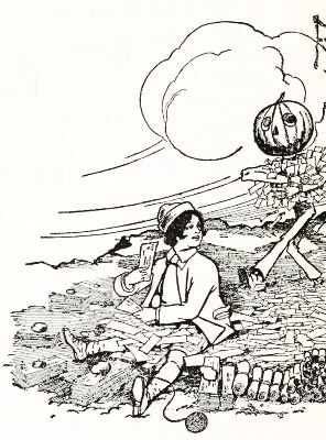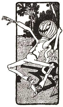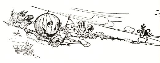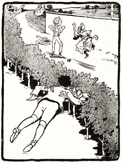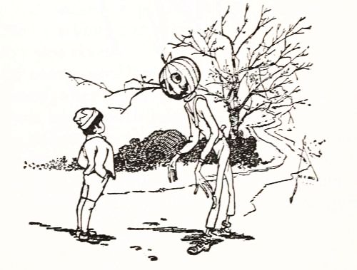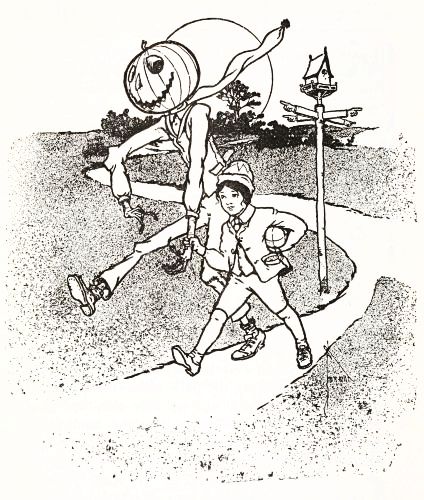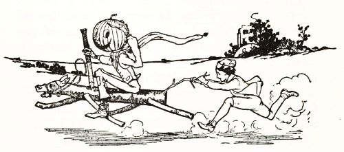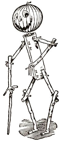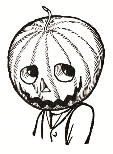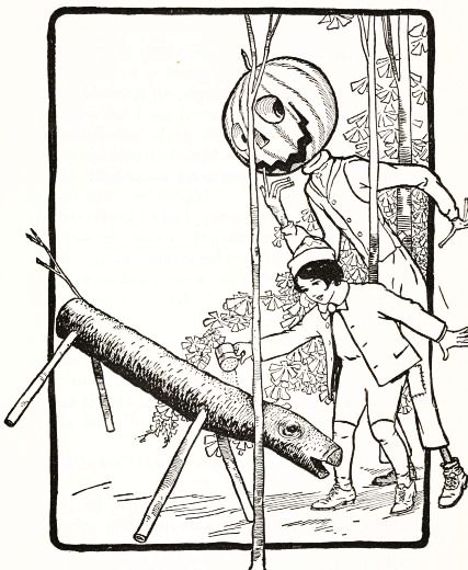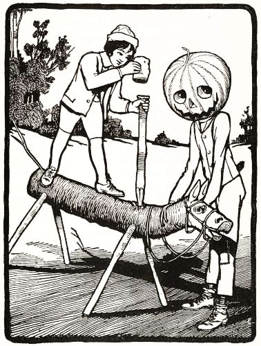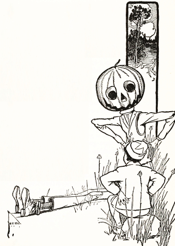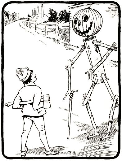 The child had no playmates, so he did not know that boys often dig out the inside of a "pumpkin-jack," and in the space thus made put a lighted candle to render the face more startling; but he conceived an idea of his own that promised to be quite as effective. He decided to manufacture the form of a man, who would wear this pumpkin head, and to stand it in a place where old Mombi would meet it face to face.
