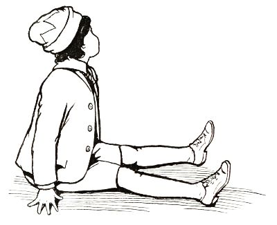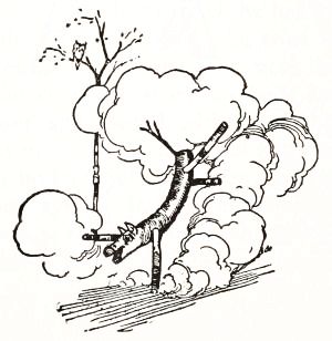 Next morning, when he looked at his work again, Tip saw he had forgotten to give the dummy a neck, by means of which he might fasten the pumpkinhead to the body. So he went again to the forest, which was not far away, and chopped from a tree several pieces of wood with which to complete his work. When he returned he fastened a cross-piece[Pg 6] to the upper end of the body, making a hole through the center to hold upright the neck. The bit of wood which formed this neck was also sharpened at the upper end, and when all was ready Tip put on the pumpkin head, pressing it well down onto the neck, and found that it fitted very well. The head could be turned to one side or the other, as he pleased, and the hinges of the arms and legs allowed him to place the dummy in any position he desired.