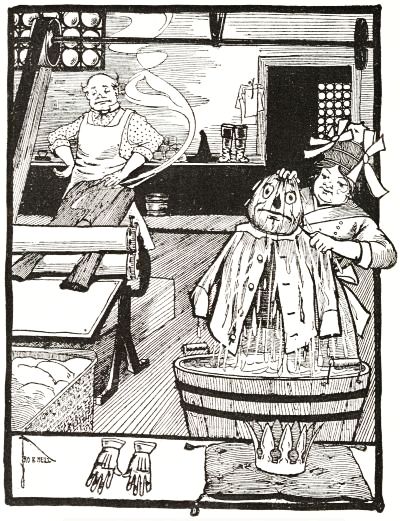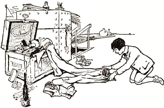 To find clothing seemed no easy task; but Tip boldly ransacked the great chest in which Mombi kept all her keepsakes and treasures, and at the very bottom he discovered some purple trousers, a red shirt and a pink vest which was dotted with white spots. These he carried away to his man and succeeded, although the garments did not fit very well, in dressing the creature in a jaunty fashion. Some knit stockings belonging to Mombi and a much worn pair of his own shoes completed the man's apparel, and Tip was so delighted that he danced up and down and laughed aloud in boyish ecstasy.