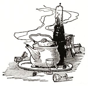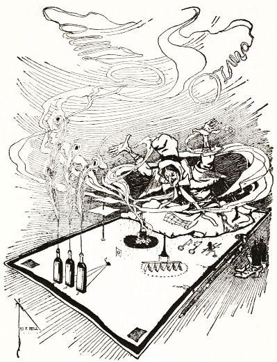 The Witch squatted upon the ground and kindled a tiny fire of dried herbs, which she drew from her bosom. When the blaze shot up and burned clearly old Mombi scattered a handful of magical powder over the fire, which straightway gave off a rich violet vapor, filling all the tent with its fragrance and forcing the Saw-Horse to sneeze—although he had been warned to keep quiet.
