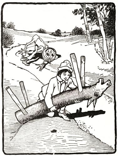 "Jack's all right, and works fine!" he said to himself, panting with the unusual exertion. But just then he discovered the man's left arm had fallen off in the journey; so he went back to find it, and afterward, by whittling a new and stouter pin for the shoulder-joint, he repaired the injury so successfully that the arm was stronger than before. Tip also noticed that Jack's pumpkin head had twisted around until it faced his back; but this was easily remedied. When, at last, the man was set up facing the turn in the path where old Mombi was to appear, he looked natural enough to be a fair imitation of a Gillikin farmer,—and unnatural enough to startle anyone that came on him unawares.