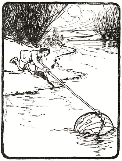 There were pumpkins in Mombi's corn-fields, lying golden red among the rows of green stalks; and these had been planted and carefully tended that the four-horned cow might eat of them in the winter time. But one day, after the corn had all been cut and stacked, and Tip was carrying the pumpkins to the stable, he took a notion to make a "Jack Lantern" and try to give the old woman a fright with it.