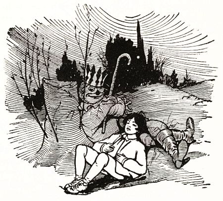 As it was yet too early in the day to expect the old woman to return home, Tip went down into the valley below the farm-house and began to gather nuts from the trees that grew there.