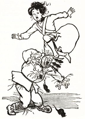 At first he was so frightened and horrified that he wanted to run away, but his legs trembled and shook so badly that he couldn't. Then it struck him as a very funny thing for Jack to come to life, especially as the expression on his pumpkin face was so droll and comical it excited laughter on the instant. So, recovering from his first fear, Tip began to laugh; and the merry peals reached old Mombi's ears and made her hobble quickly to the hedge, where she seized Tip's collar and dragged him back to where she had left her basket and the pumpkin-headed man.