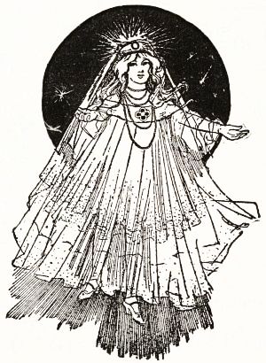 Glinda walked to the canopy and parted the silken hangings. Then she bent over the cushions, reached out her hand, and from the couch arose the form of a young girl, fresh and beautiful as a May morning. Her eyes sparkled as two diamonds, and her lips were tinted like a tourmaline. All adown her back floated tresses of ruddy gold, with a slender jeweled circlet confining them at the brow. Her robes of silken gauze floated around her like a cloud, and dainty satin slippers shod her feet.