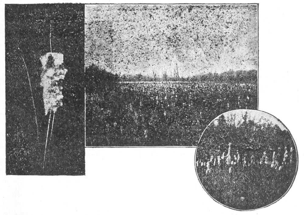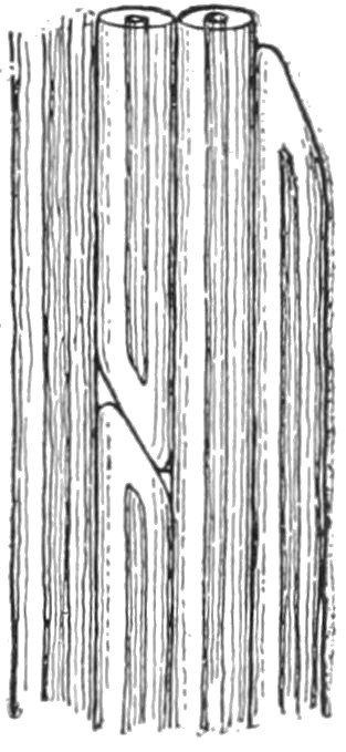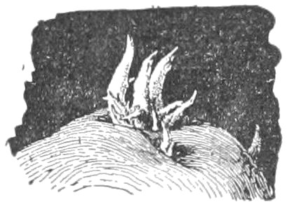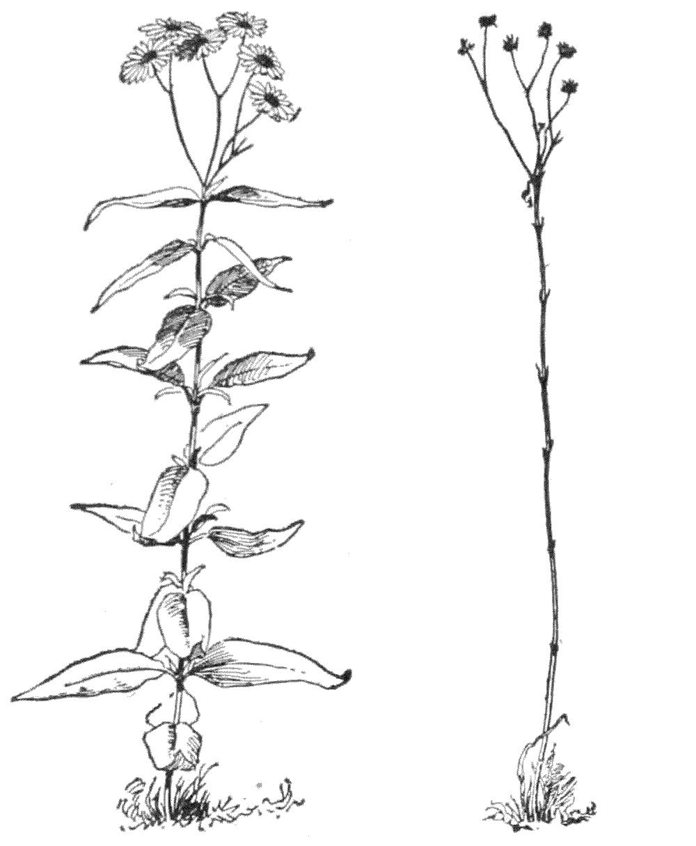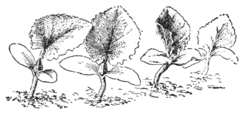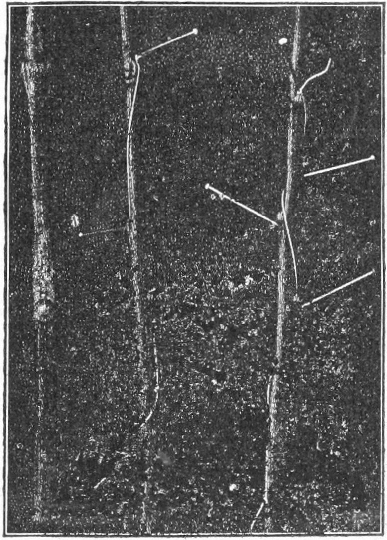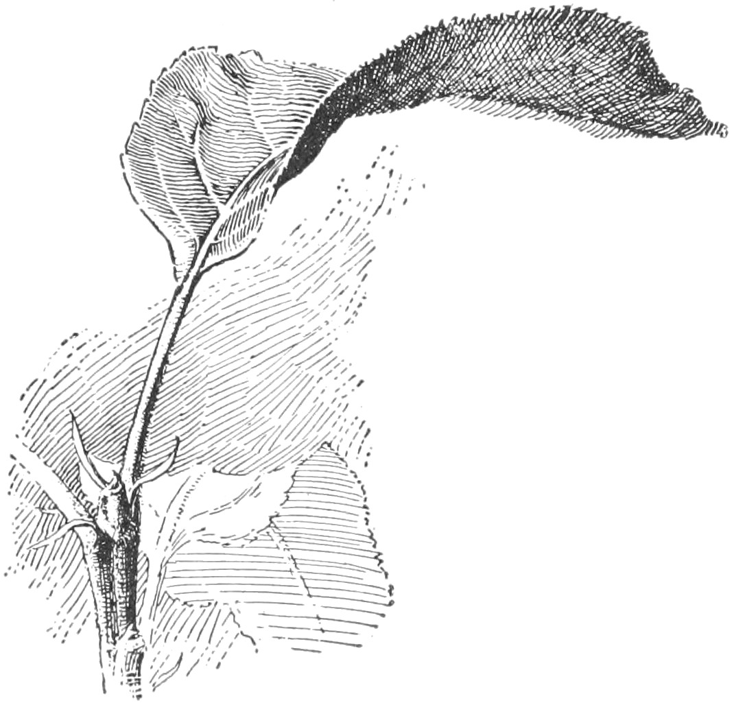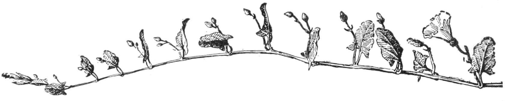 Suggestions.—The pupil should study any plant, or branch of a plant, with reference to the position or condition under which it grows, and compare one plant or branch with another. With animals, it is common knowledge that every animal is alert to avoid or to escape danger, or to protect itself. 2. It is well to begin with a branch of a tree, as in Fig. 1. Note that no two parts are alike (Chap. I). Note that some are large and strong and that these stand farthest toward light and room. Some are very small and weak, barely able to live under the competition. Some have died. The pupil can easily determine which of the dead branches perished first. He should take note of the position or place of the branch on the tree, and determine whether the greater part of the dead twigs are toward the centre of the tree top or toward the outside of it. Determine whether accident has overtaken any of the parts. 3. Let the pupil examine the top of any thick old apple tree, to see whether there is any struggle for existence and whether any limbs have perished. 4. If the pupil has access to a forest, let him determine why there are no branches on the trunks of the old trees. Examine a tree of the same kind growing in an open field. 5. A row of lettuce or other plants sown thick will soon show the competition between plants. Any fence row or weedy place will also show it. Why does the farmer destroy the weeds among the corn or potatoes? How does the florist reduce competition to its lowest terms? what is the result?