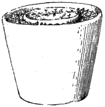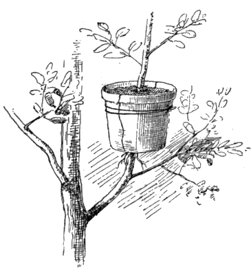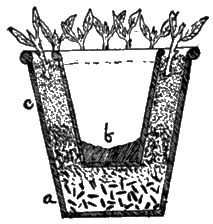 Regulation of Moisture.—Moisture is the most important factor in seedage. It is usually applied to the seeds by means of soil or some similar medium, as moss or cocoanut fiber. Fresh and vigorous seeds endure heavy waterings, but old and poor seeds must be treated sparingly. If there is reason to suspect that the seeds are weak, water should not be applied to them directly. A favorite method of handling them is to sow them in a pot of loose and sandy loam which is set inside a larger pot, the intermediate space being filled with moss, to which, alone, the water is applied. This device is illustrated in Fig. 1. The water soaks through the walls of the inner pot and is supplied gradually and « 10 » constantly to the soil. Even in this case it is necessary to prevent soaking the moss too thoroughly, especially with very weak seeds. When many pots are required, they may be simply plunged in moss with the same effect. The soil should be simply very slightly moist, never wet. Moisture is sometimes supplied by setting the seed-pot in a shallow saucer of water, or it may be sufficient to simply place it in the humid atmosphere of a propagating-box. Large seeds may be laid upon the surface of the soil in a half-filled pot, covered with thin muslin, and then covered with loose and damp loam. Every day the pot is inverted, the covering taken off and fresh soil is added. A modification of this plan for small seeds can be made by placing the seeds between two layers of thin muslin and inserting them in damp loam, which is frequently renewed to avoid the extremes which would result from watering or from allowing the soil to become dry. In these last operations, no water is applied to the seeds and they constitute one of the most satisfactory methods of dealing with seeds of low vitality. They are essentially the methods long ago used by Knight, who laid such seeds between two sods cut from an old and dry pasture.