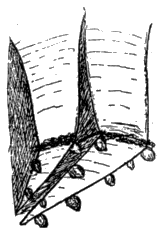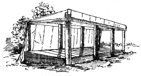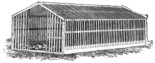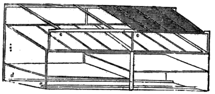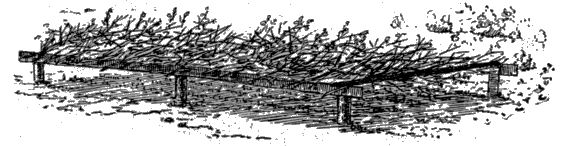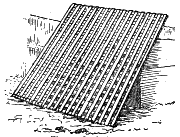 There are many kinds of screens in use to prevent the drying out of small seeds in out-door seedage and to protect the young seedlings. These are used also in the shading of cuttings. The common lath screen (Fig. 3) is the most useful for general purposes. It is simply a square frame made from common laths laid at right angles in a double series. The interstices between the laths are equal in width to the laths themselves. These screens are laid horizontally upon a light frame-work a few inches above the seeds. The passage of the sun constantly moves the shadows over the bed, and sufficient shade is afforded while thorough ventilation is allowed. This and all other elevated « 13 » screens are useful in shading and protecting the young plants as well, but when used for this purpose they are usually raised a greater distance above the beds. A brush screen consisting of a low frame covered with boughs, is often used, as shown in Fig. 4. This is cheaper than the lath screens, and is equally as good for most purposes. The brush is often laid directly upon the ground, especially in large beds. This answers the purpose of shading, but it does not allow of weeding and it must be taken off soon after the seeds germinate, or slender plants will be injured in its removal. Brush screens are sometimes raised three or four feet to allow of weeding. A screen for frames is shown in Fig. 5. It is a simple covering of muslin stretched over the top and sides of a rough frame-work. The cloth is usually omitted from the front side. This style of screens is much used by nurserymen, especially for cutting beds. Whitewashing the sashes also affords good shading. A more elaborate and permanent screen is shown in Fig. 6. It is built « 14 » of slats, usually 3-inch stuff. This shed screen is oftenest used for the protection of tender plants, but it affords an exceedingly useful and convenient place for the storage of pots and boxes of slow-germinating seeds.