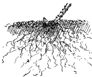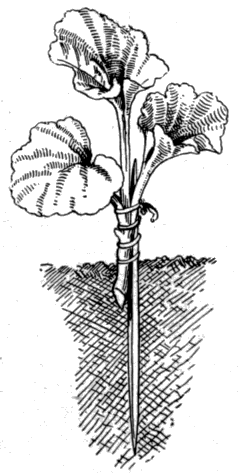 Sowing.—The soil in which seeds are sown, especially in in-door culture, should be such as to allow of perfect drainage and at the same time to hold moisture. Good potting soil, with a liberal allowance of sharp sand, is the best for general purposes. Pure sand becomes too dense, and leaf mold alone is usually too loose and open. A proper combination of the two corrects both faults. It is impossible to describe a good potting or seed-bed soil. Some experience is essential to the best results in preparing it. It should be of such character that when a damp portion is firmly compressed in the hand it will fall apart when released. It should never bake. Good old garden loam, to which an equal quantity of sand has been added, is usually a good soil for common in-door seedage. There should be no manure in soil used for seeds which produce a delicate growth, as rhododendrons and kalmias. In all such cases, rotted sod or leafy peat forms the best basis. The soil should be sifted and thoroughly fined before seeds are put into it. Seeds usually require lighter soil than that in which the growing plant will flourish. Cocoanut fiber is sometimes used in place of the soil, as it holds moisture, allows of almost perfect drainage, and does not become “sour.” Fine dead sphagnum moss may also be used. Orchid seeds are usually sown on the live moss in which the parent plant is growing; or they may be sown on damp wood or cork. (See under Orchids, Chap. VI.) Small seeds, like those of cineraria and calceolaria, germinate well in very old cow-dung obtained from a pasture; the unctuous matters have disappeared, leaving a fibrous remainder. But all things considered, well-prepared soil is the most satisfactory medium which can be used. Seeds of aquatic plants which are to be sown in a pond may be placed in a ball of clay and dropped into the water.