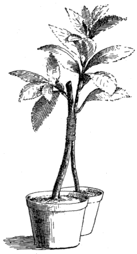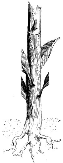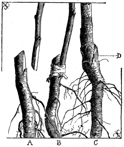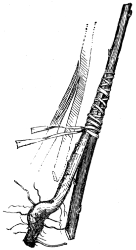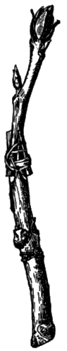| II. On roots of other plants.—Graftage. | 1. By detached scions. | I. Budding: Shield, flute, veneer, ring, annular, whistle or tubular. | ||||||