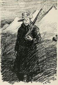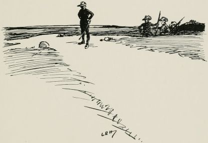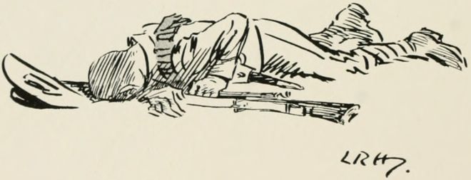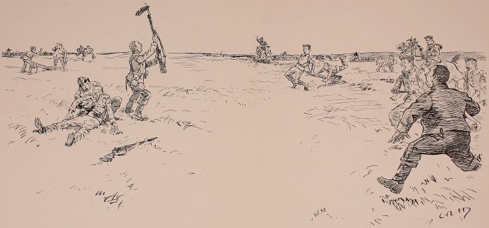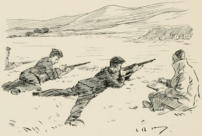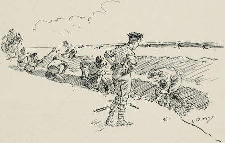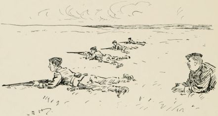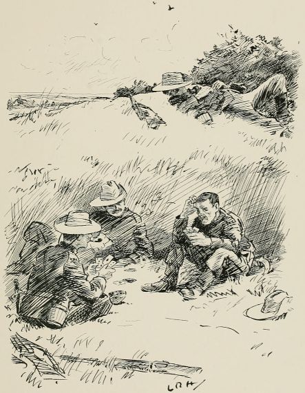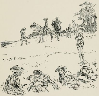 After breakfast we was out again doin' outposts. Wish they wouldn't 'ave so much make believe about it. Supposin' now they puts yer in a group as sentries. "The henemy," they ses, "is somewhere over there, an' you've to watch that bit o' country in front of you; the countersign's 'Bunkum,' an' you've to keep under cover." Well, there aint no henemy, an' nothin' aint goin' to 'appen, an' yer wouldn't know wot to do if it did, so you just lies down an' smokes till the "assembly" goes, an' then you comes back. It may teach officers something, but it don't teach us much.
