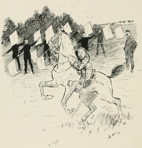 Friday.—Revelly 'arf 'our earlier this morning, as we 'ad a longish march to do. Precious 'ot it were, too, an' we were main glad to get a rest before beginning operations. Don't know what we was supposed to be doin', but we got posted on the side of an 'ill where we could 'ave seen everything as was goin' on, but d'rectly you gets up to 'ave a look some one starts bellerin', "Lie down there!" till we all got the bloomin' 'ump. After a bit they takes us back the way we come and we lay down again, then they advances us up the 'ill again; then they shifts us about all over the shop, backerds an' forrards, till we didn't know where we was. At last a off'cer comes galloping over to our Colonel and they seemed to be 'avin' a few words, and we advances an' 'alts, advances an' 'alts, for about a hour an' a 'arf, an' then just as we was getting up to the firing line an' thinkin' this was a bit of all right at last, the bugles go, "Cease fire." "Taint fair," ses Dick Jennings; "let's shoot the bloomin' humpire." Getting back to camp were a bit thick, 'ow we did it without fallin' out I don't know. No one who aint done it theirselves knows wot marchin' ten mile in fours on a road two inches deep in dust is like; yer rifle weighs about a ton, an' yer water's gone at the first 'alt. The bloomin' band as ought to 'ave met us an' played us 'ome, went an' lost itself, an' never showed up till we was almost back to camp. Colonel 'e's give out as every man is to 'ave a hextra pint issued to 'im. I 'ad three more on my own; 'ad a bit of a sing-song in the evenin', but we was too tired to do much.