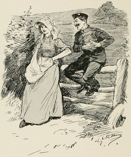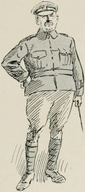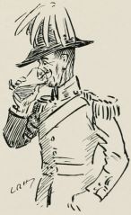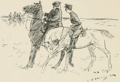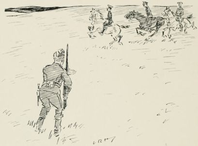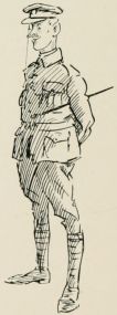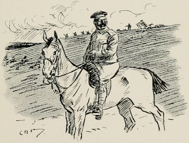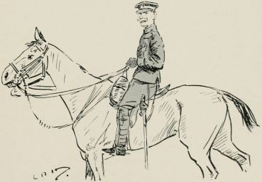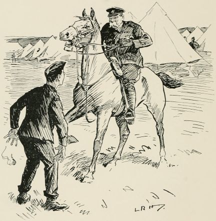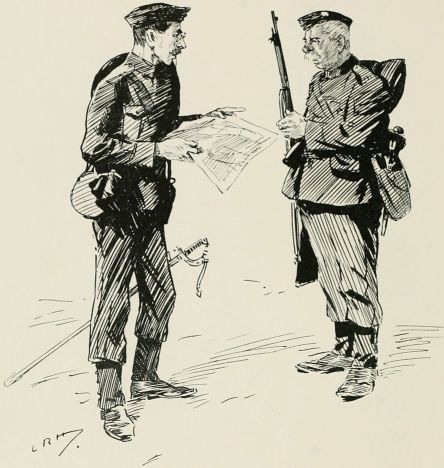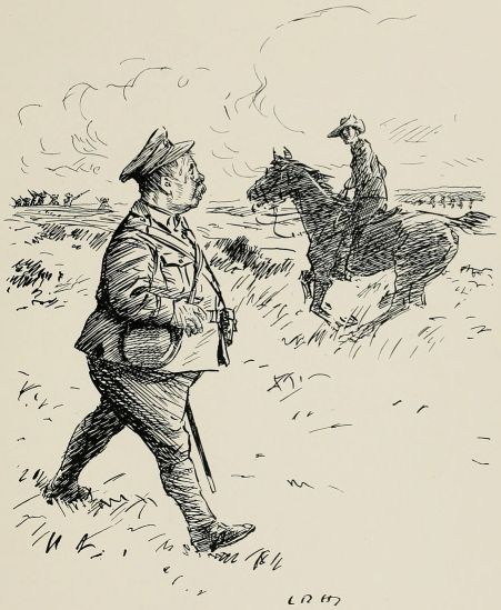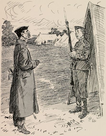Got sent out with a patrol again. Saw a General ridin' along our way, so we got be'ind an 'edge till 'e'd gone by. Just after we got back to the picket another General comes along an' asks all sorts of questions, an' didn't seem to think much of the answers 'e got. We was all 'oping it were over for the day, when along comes a whole lot o' Generals all together, and one of 'em calls out to us to fall in. We gets up an' begins dusting ourselves down a bit, when 'e yells at us for not being in our places at once, an' goes for us 'ot an' strong; then 'e starts asking questions as made me shiver. All of a sudden 'e ses: "Who was in charge of the last patrol as went out?" The Captain calls me up, and the General ses, "Where did you go?" I tells 'im I went as far as the wood. "See anything of the enemy?" 'e ses. "There weren't none there," I ses. "How do you know?" ses 'e; "you ar'n't allowed to enter the woods about here." "Well, Sir," I ses, "we didn't go in, but there's only two places where anybody could get in without doing damage, and there weren't no footmarks there." "What forage can I get down there?" 'e ses. "There's about three ton o' bad 'ay, Sir, at one of the cottages, but it aint worth 'aulin'," I ses, an' 'e tells me to fall back in the ranks, which I was precious glad to do. Our Captain said, when they was gone, as 'ow I'd answered very well, an' 'ow I ought to go for a stripe. I said as I should like to.
