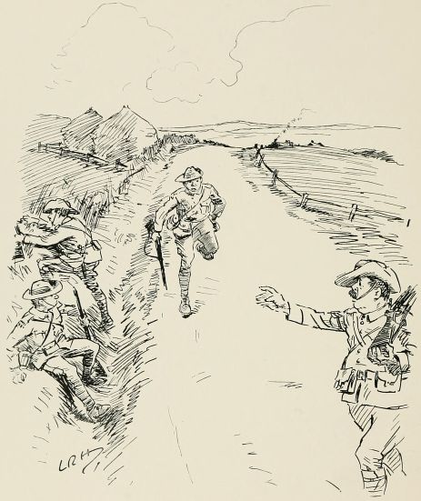 As we was out for the day only 'ad a sort o' bread an' water picnic instead of dinner, which we 'as when we gets back to camp. We was put through what they calls an attack drill after, but I didn't think much of it; started off with about twenty yards between you an' the next man, an' then as we advanced, they comes crowdin' up from be'ind till the firin' line were like a bloomin' football scrimmage, with about four different Battalions all atop o' one another, an' loosin' off right an' left whether they was in front or be'ind. "'Ere," I ses to Ted Parminter, "this aint no place for us, it's too bloomin' dangerous. I'm going to be a casualty." An' we drops be'ind. "Wot bally rot!" I 'eard one off'cer say, an' I quite agreed with 'im.