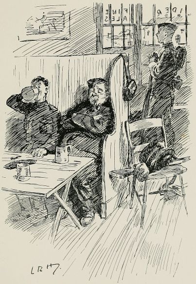 "Ullo, what's this?" said the Sergeant. "Recruits? That's right. Shut the door be'ind you, an' keep out the cold. I'm glad to see the lads about here is waking up, an' I wish more 'ud copy their example! Them cripples in the next village ain't got enough spirit to get up a dog-fight, let alone learn 'ow to 'andle a rifle; all they're fit for is funerals. Now let's look at you," he continued, and the deep-set grey eyes ran swiftly over the lads. "You'll do all right. Now, listen to me; afore ye signs on, I've got to read over a lot o' reg'lashuns to ye, so as you'll clearly understand what ye're promisin' to do. Now reg'lashuns is like Acts of Parlyment, no two persons can agree as to what they mean, so you won't understand them, probably; but that's not important, as my experience of the ways o' Gov'mint teaches me that they'll be altered shortly, so there's no need for ye to worry. But the one thing ye have to do is, to do as ye're told; attend to that now. It's the blessid privilege of the volunteer to endeavour to make himself a soldier in spite of all obstacles, an' what the reg'lar takes months to learn, an' the militia weeks, 'e 'as to try and do in days, so 'tis no picnic if 'e's goin' to do 'is duty. An' duty don't mean church parades, an' the annual dinner, an' as little else as you can; duty means everything you can possibly do, an' it's the pride of a good lad, that if there's an extry job o' work to be done, e's the lad that'll do it; for there's none better than a keen Volunteer, an' no one worse than a slack one, that'll turn up smart when the drinks is free, but is most unduly anxious about 'is master's business on other occasions, a nuisince to 'is sergeant, 'is captin', 'is colonel, an' 'is country; an' if I thought you were that sort I'd send ye to the right-about now, but I think, by yer looks, ye have the makings o' soldiers. Now, if there's anything ye want to know, now's the time to ask. What's that? Ye don't know if ye're up to standard? Fancy a lad 'avin' the face to ask me that! Why, when I was a boy, with a couple o' corks in me heels, an' a wisp o' straw under me waistcut, I'd a' passed for a giant. When you've learnt to throw a chest and hold yer heads up, yer own mothers won't know yer. Now, after I've read over these 'ere reg'lashuns, ye'll sign these papers, an' when the doctor's passed you, go an' tell yer best girls that ye'll 'ave yer futtygraphs took d'rectly yer uniforms is ready. You will p'rade at seven o'clock, sharp, mind ye, nex' Monday."